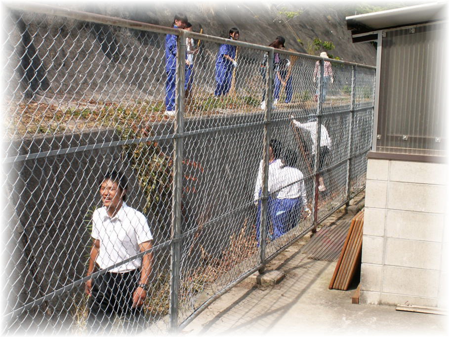 | 清掃活動の打ち合わせの様子です | 斜面の雑草をきれいにしました | 校舎の裏のほうもきれいにしました |